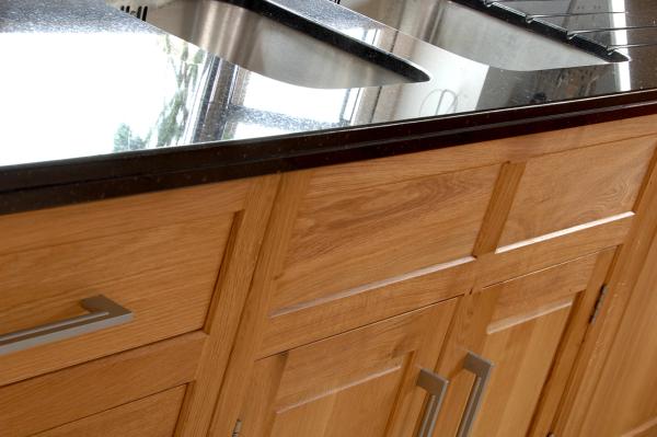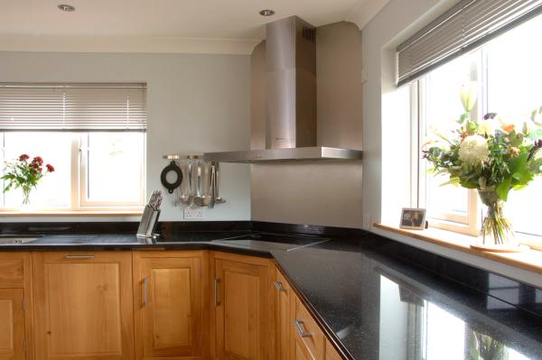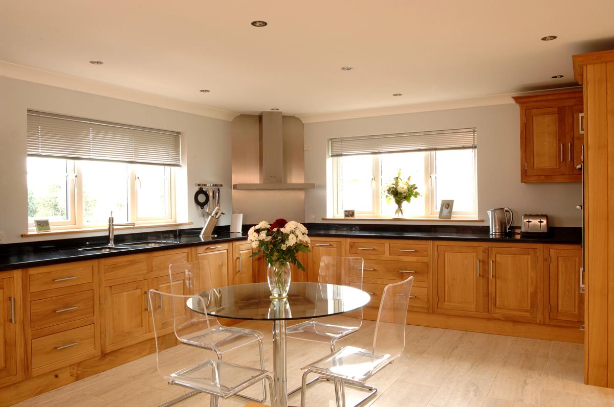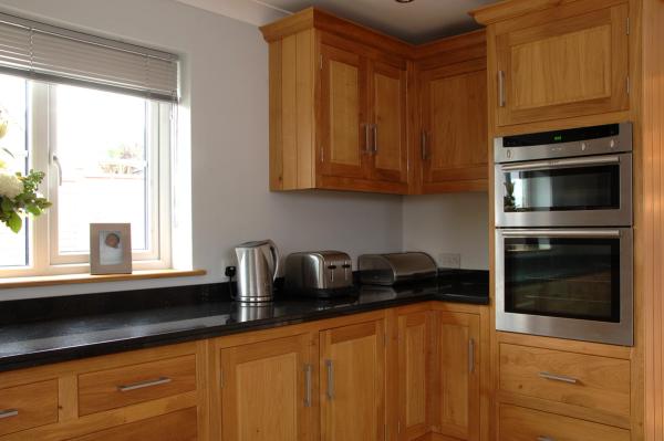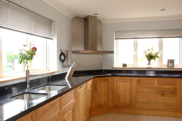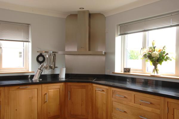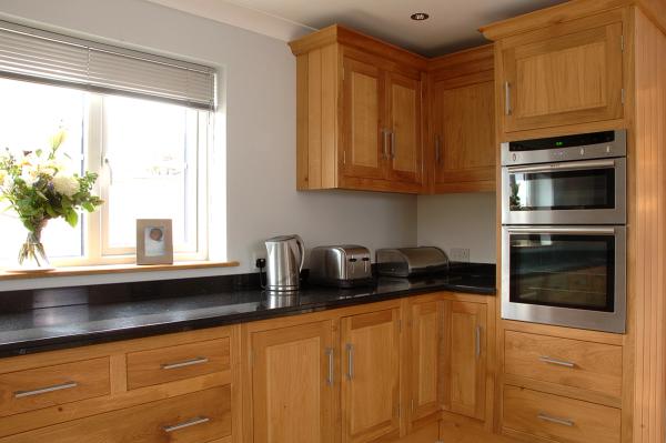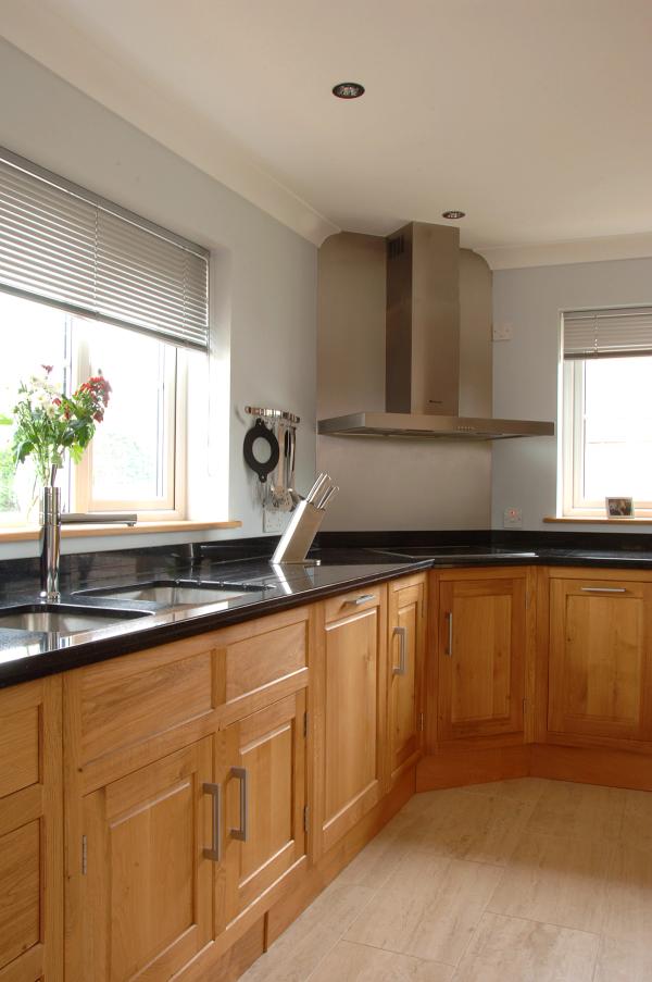 Edge filled wooden kitchen with corner cooking zone